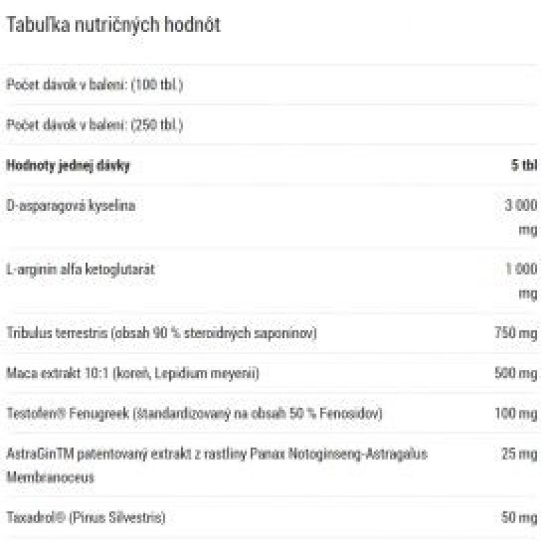 | Účinky | Zvýšení hladiny testosteronu, zvýšení svalové síly, zlepšení sexuálního zdraví |